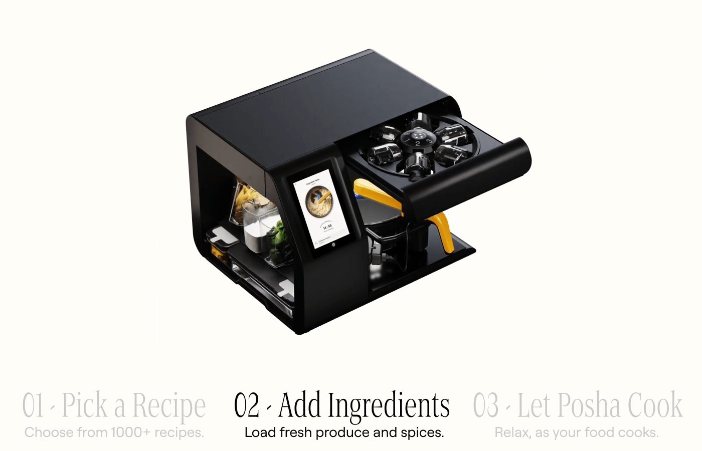 Then he got a Posha. It's an AI cooking robot that sits on your counter. You load the ingredients, select a recipe, and it takes over completely. It handles stirring and timing while adjusting heat automatically. A built-in camera monitors everything in real time — watching the onions brown, the sauce thicken, making small adjustments as it goes.